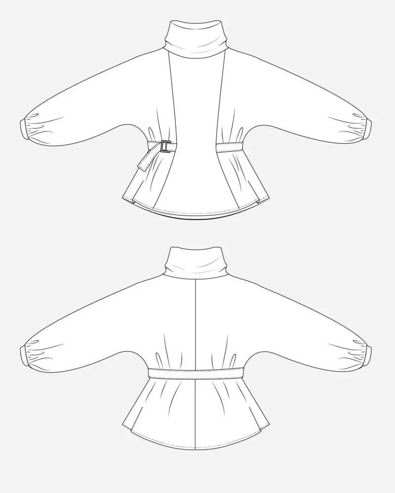 Meet your new cozy statement piece: the Haadia Top. This PDF sewing pattern features an easy, relaxed batwing/dolman sleeve shape, a soft funnel/turtleneck collar, and a waist-cinching belt that creates a flattering, peplum-style silhouette without feeling tight. The sleeves finish with a gently gathered cuff, and the hem has a clean, modern curve for that “comfort—but make it cute” vibe.